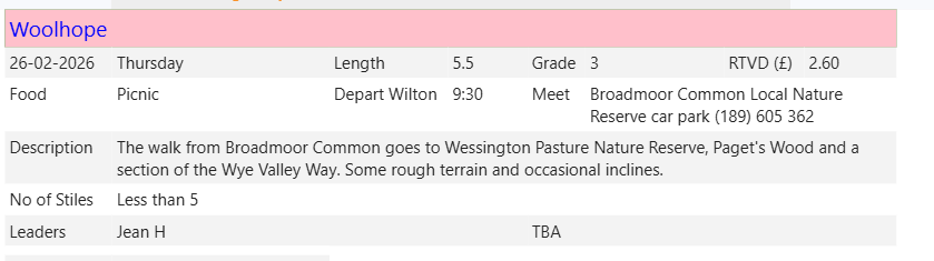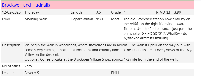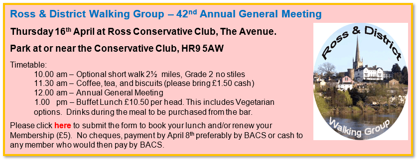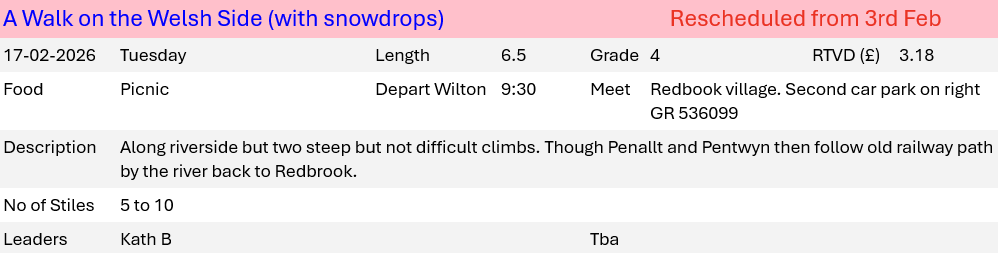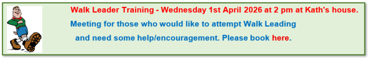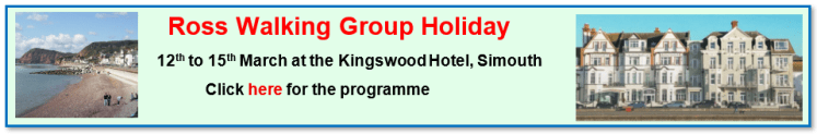 The ‘Depart’ time for all walks will be the time we leave Wilton. Monday to Friday this will be the Ross Sports Centre, at weekends it will be the Wilton Car Park. There is no need to book and members can, of course, proceed directly to the start of the walk but in this case we suggest you let the leaders know.
